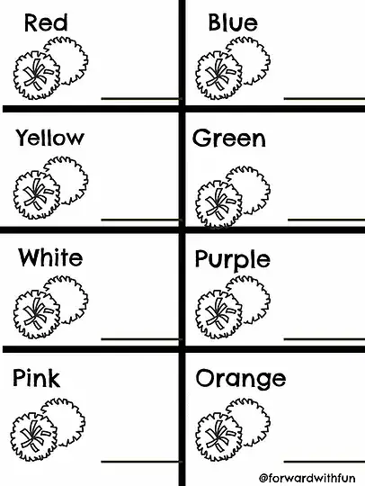 You can choose to do these activities with any kind of colorful objects. My favorite is pom poms, but when I do this with my classroom, I have used colorful candies like candied hearts, skittles, M & M's. Kids love to sort the objects given to them in a bag, a scoop, a box, anything. Have them count and record the number on the freebie sheet. Don't have that color? Record a zero.